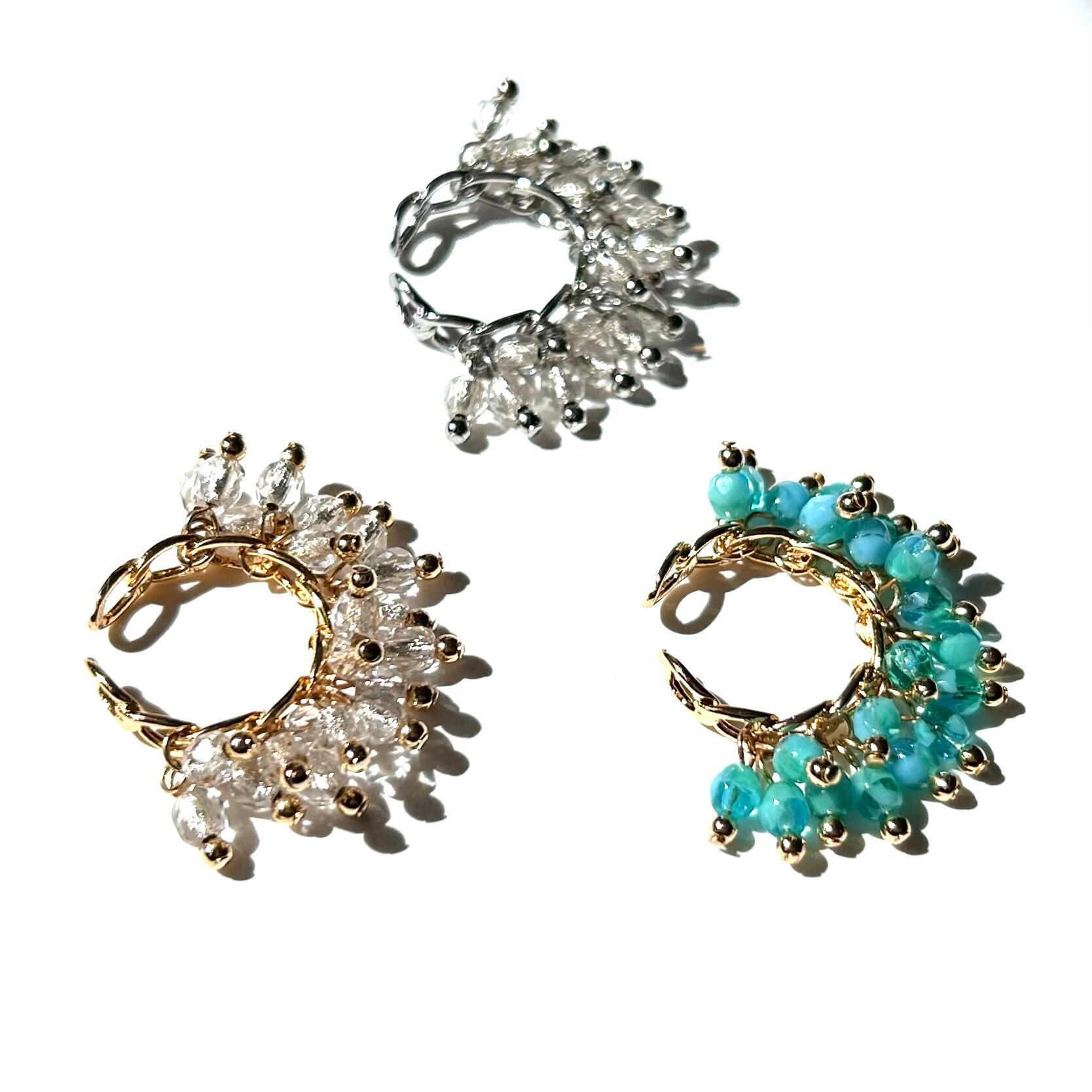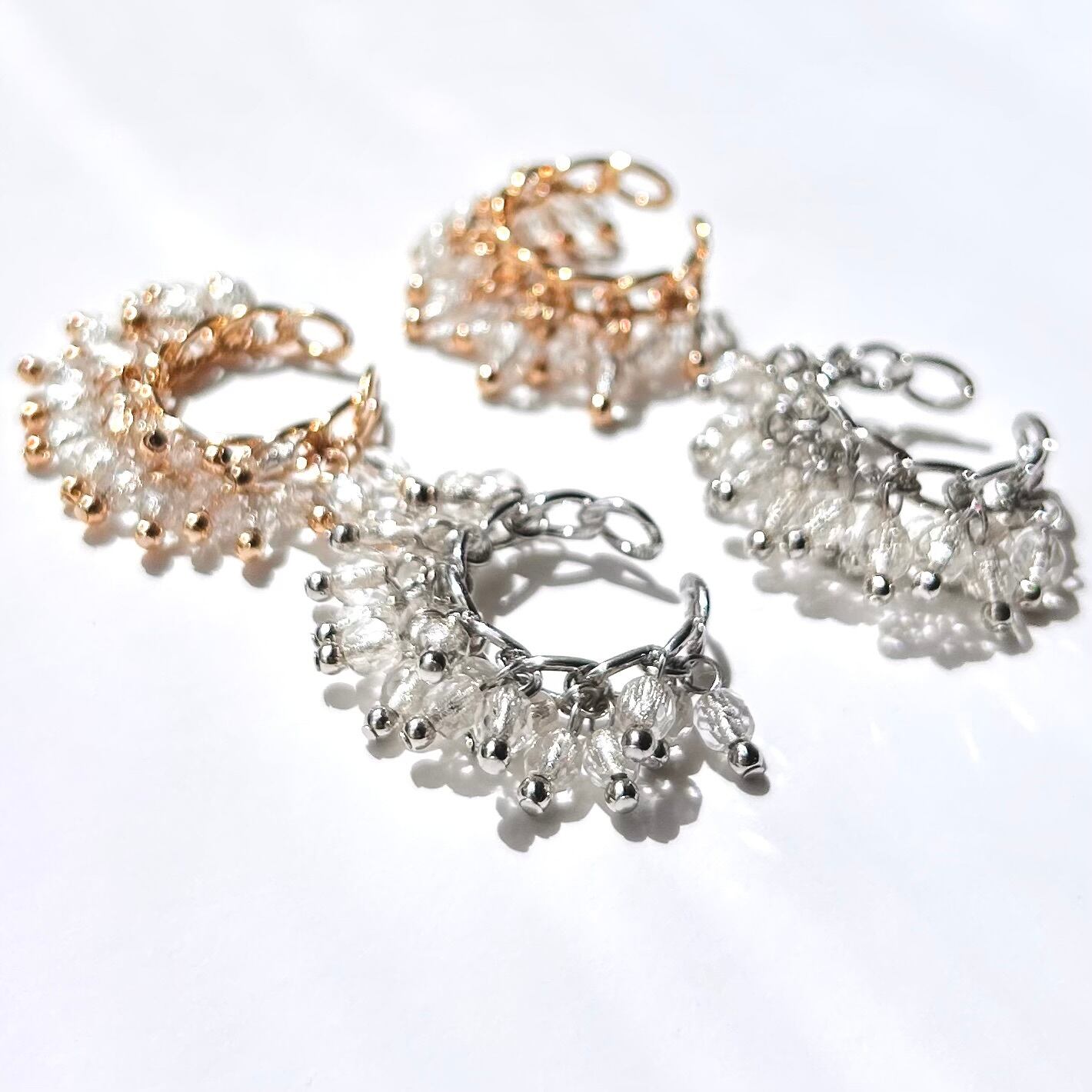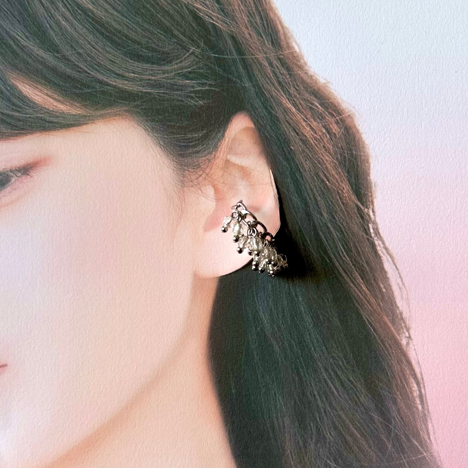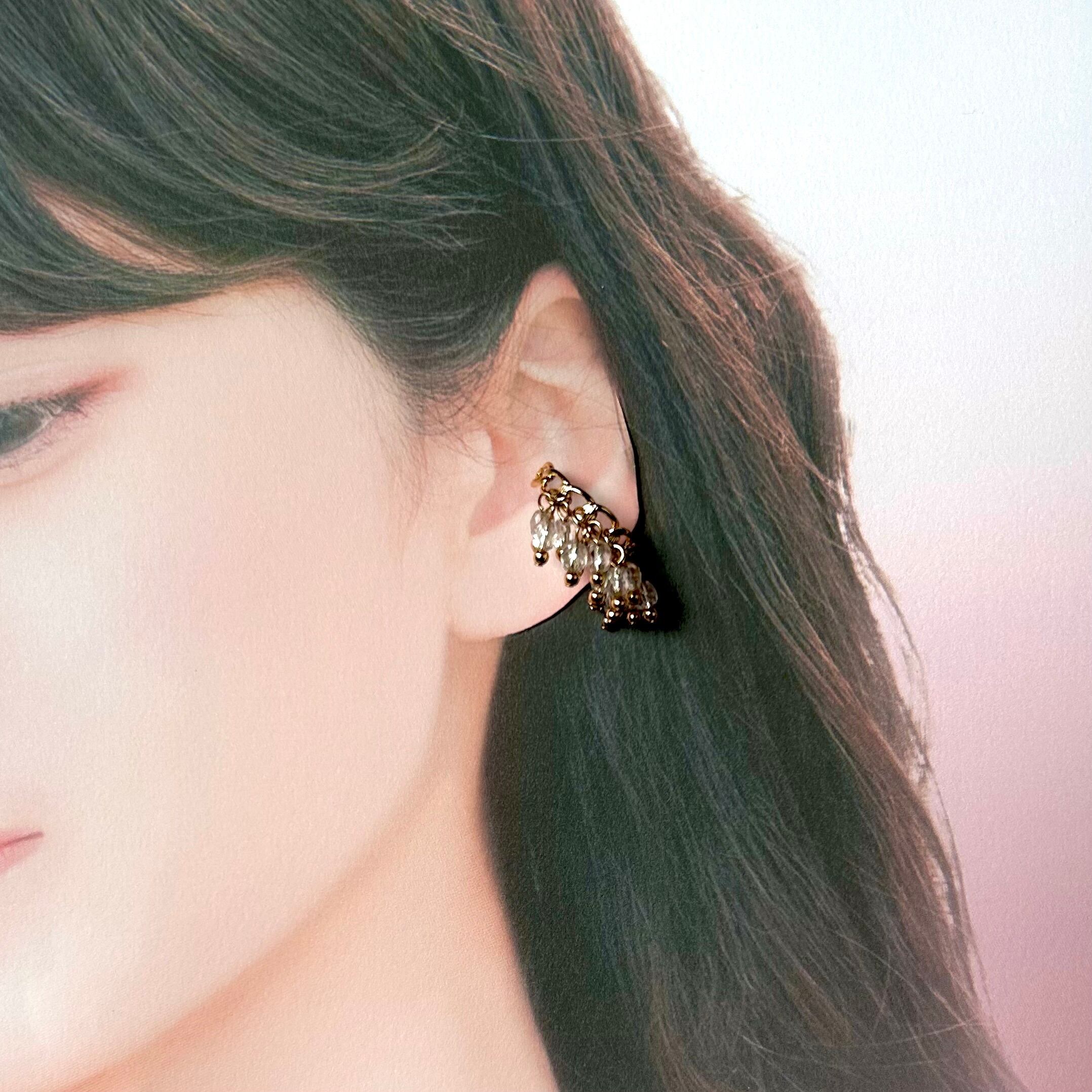 カジュアルでありながら上品さを持つ、シャラシャラとした揺れ感が特徴のイヤーカフ。内部にシルバーメッキが施されたチェコガラスが穏やかに輝きます。