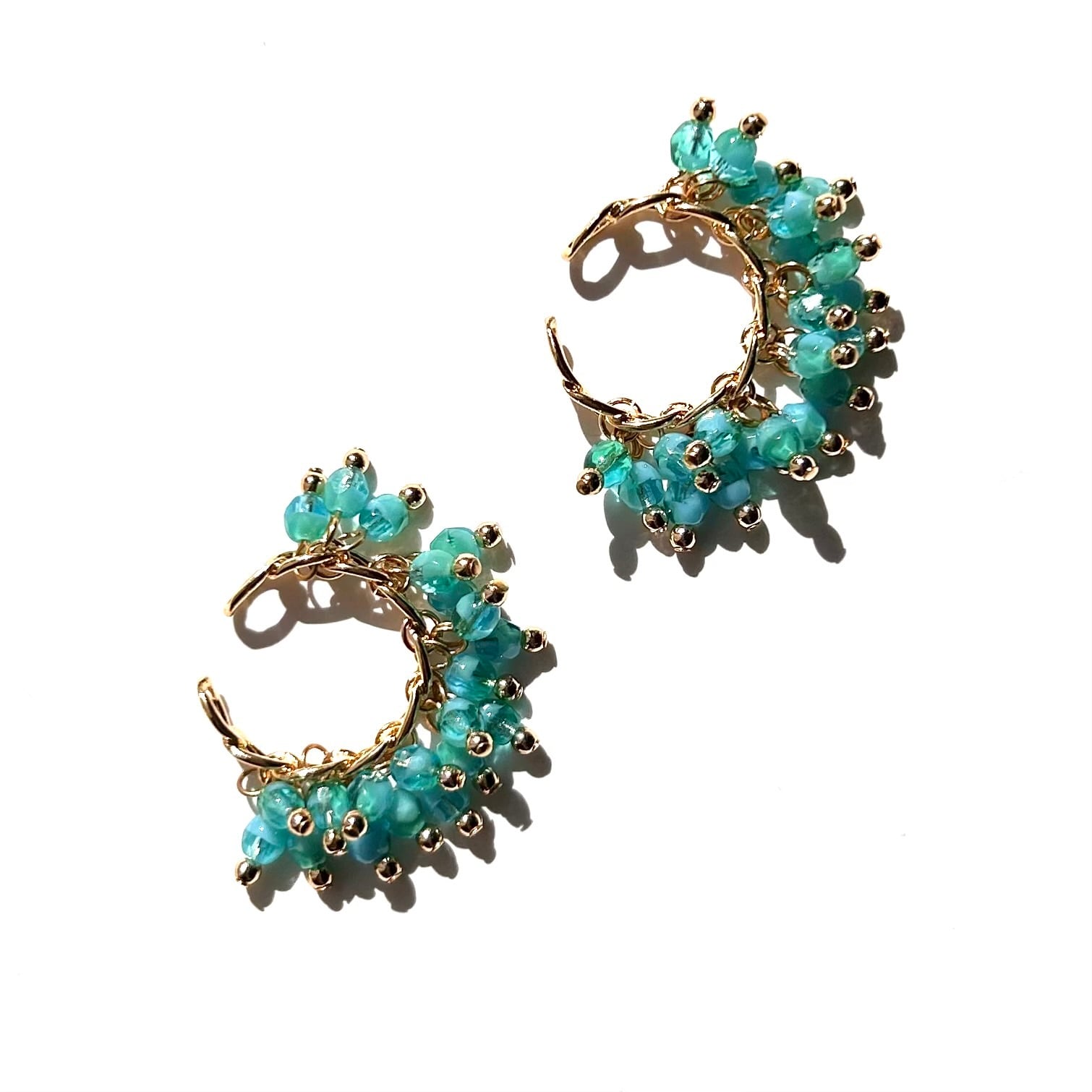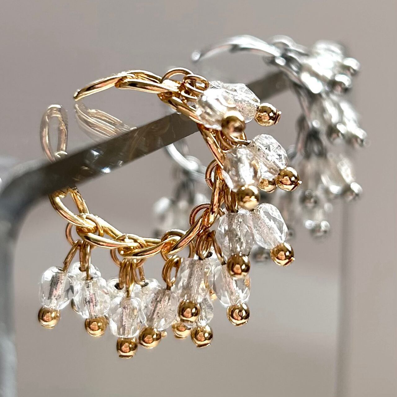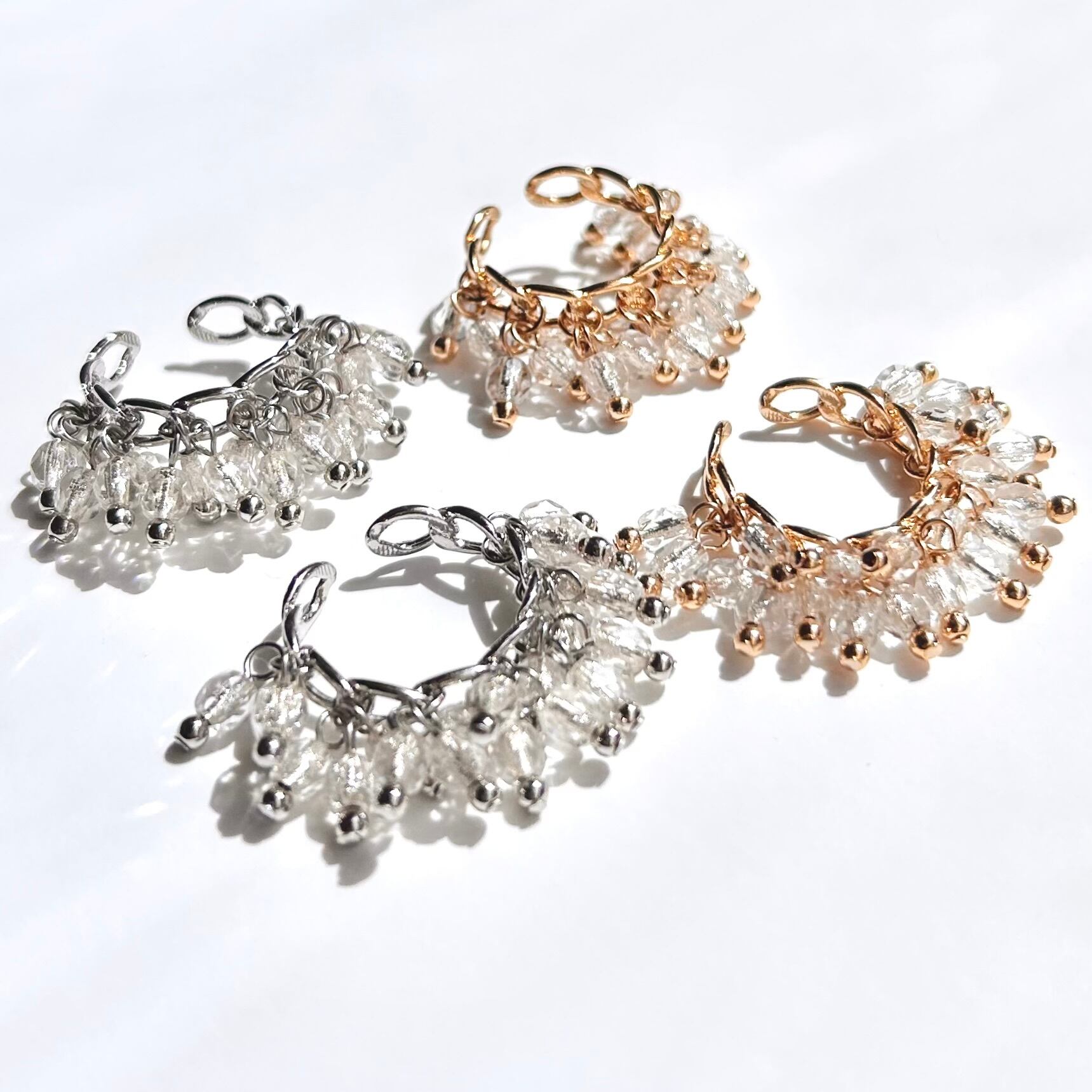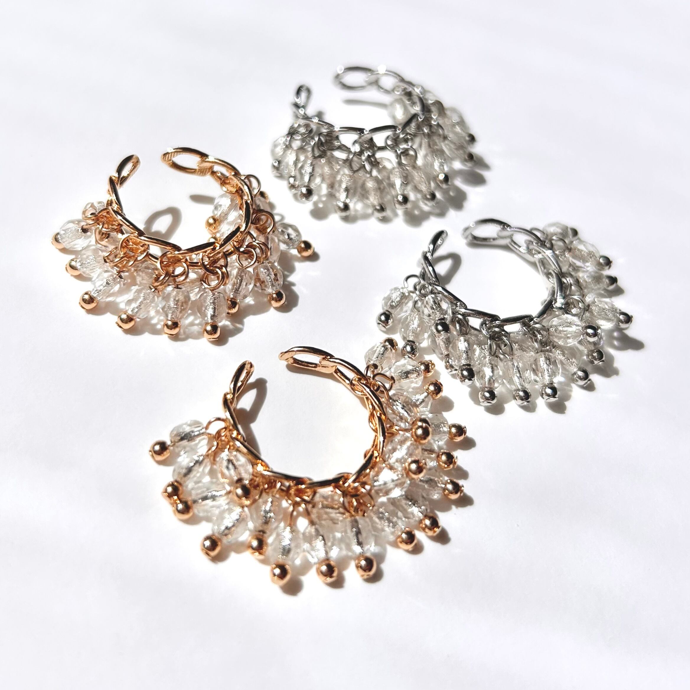 カジュアルでありながら上品さを持つ、シャラシャラとした揺れ感が特徴のイヤーカフ。内部にシルバーメッキが施されたチェコガラスが穏やかに輝きます。
